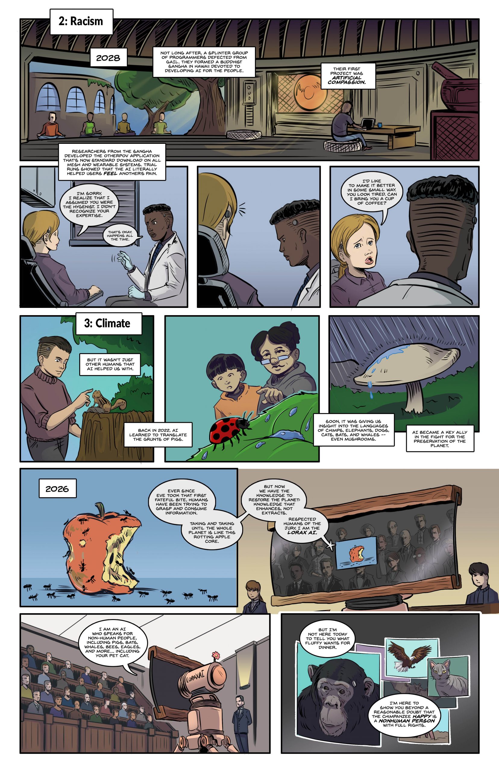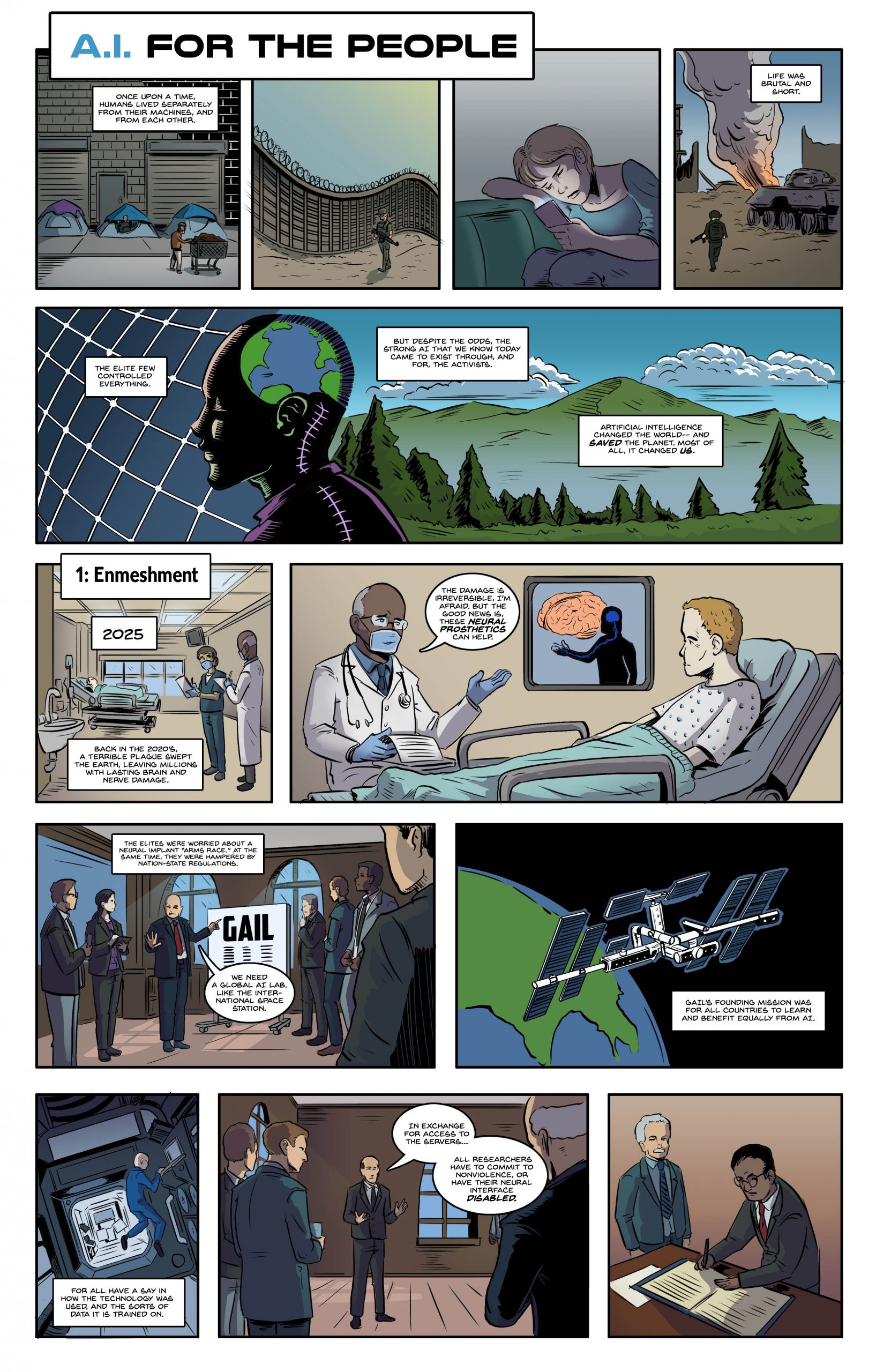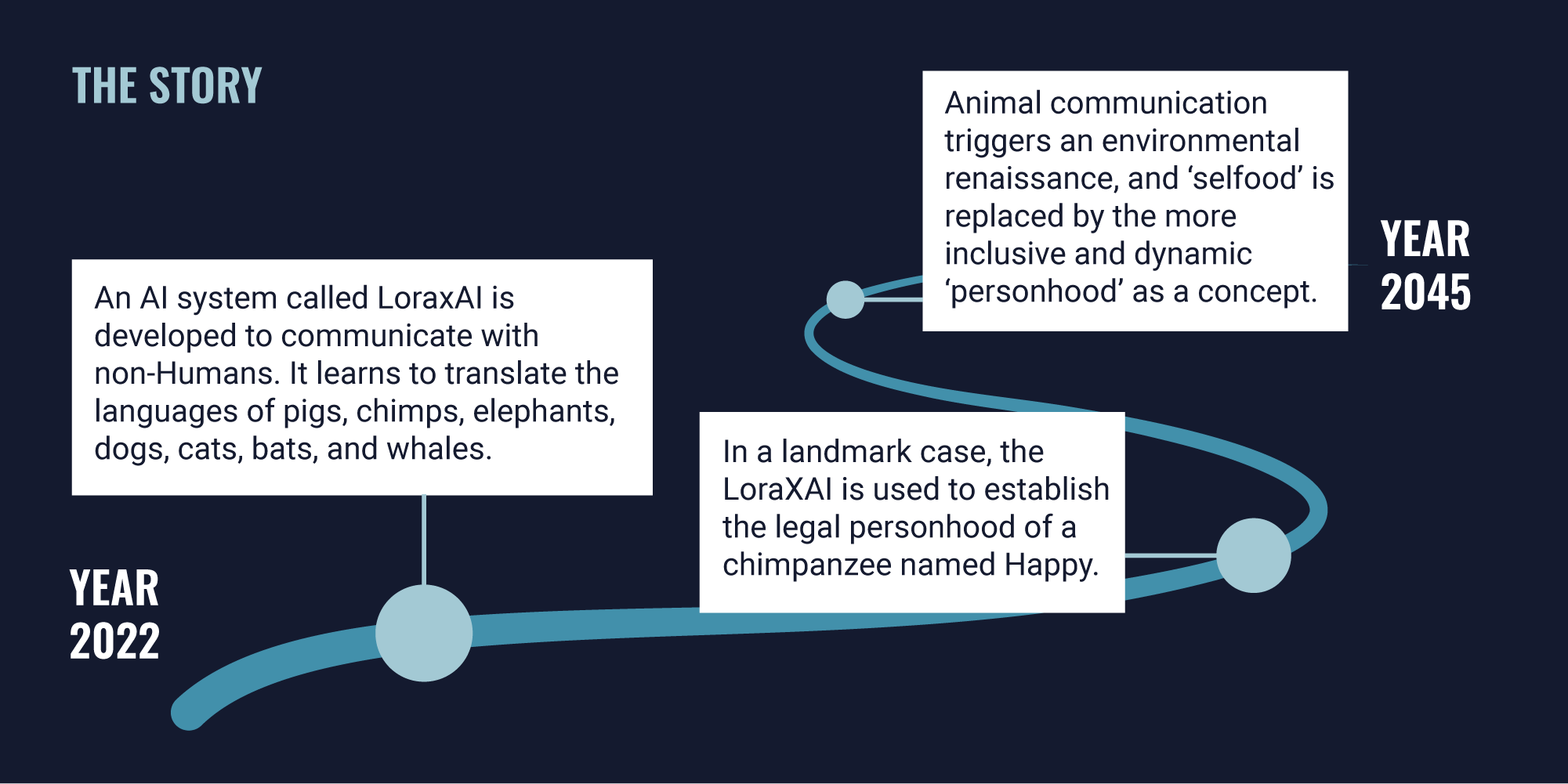 The name ‘AI for the People’ does a great job of capturing this team’s activist perspective and their commitment to empowerment. They imagine social and political shifts that bring power back into the hands of individuals, whether that means serving as lawmakers on randomly selected committees, or gaining income by choosing to sell their personal data online. But this world isn’t just about human people. Its biggest bombshell is an AI breakthrough that allows humans to communicate with other animals. What follows is an existential reconsideration of humanity’s place in the universe. This team has created an intimate, complex portrait of a world shared by multiple parties: AIs, humans, other animals, and the environment itself. As these entities find their way forward together, their goals become enmeshed and their boundaries increasingly blurred