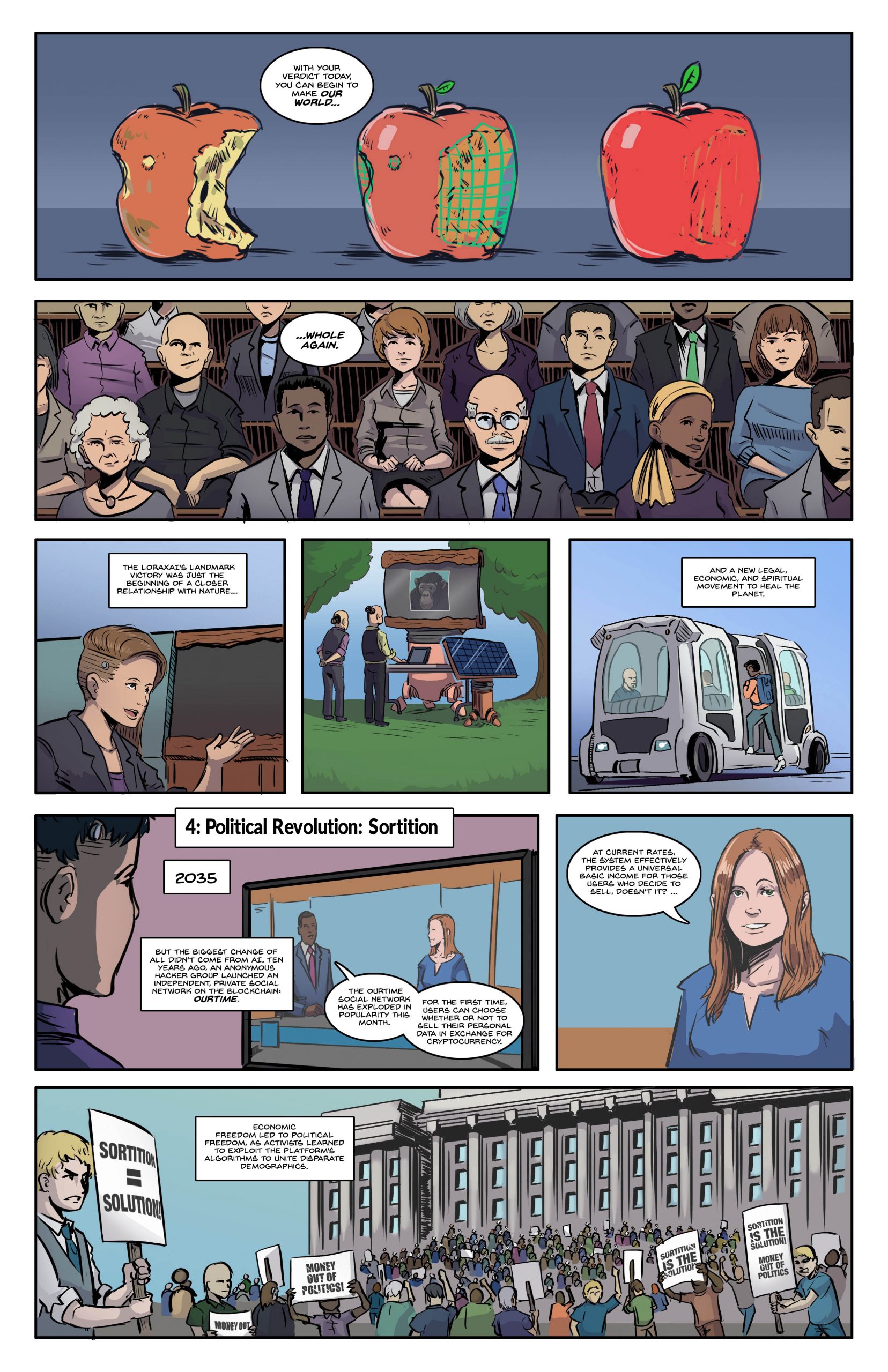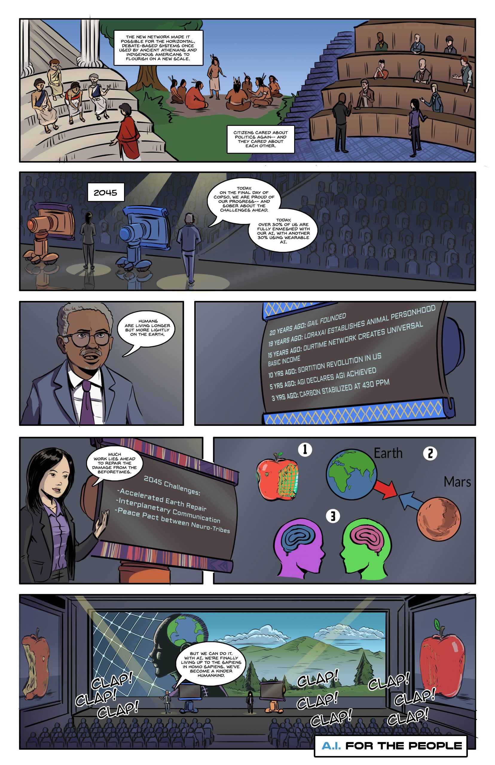 A. The US and EU, finding inspiration in Greek antiquity, turned toward sortition-based democracies that gave significant decision making power to assemblies of randomly selected citizens. AI was instrumental in making sortition feasible on a national and multi-national scale. It helped provide and organize information to those bodies tasked with researching problems and proposing policies. Political participation for the greater, long-term good of one’s community increasingly became a site of meaning for people as their economic jobs receded in importance.