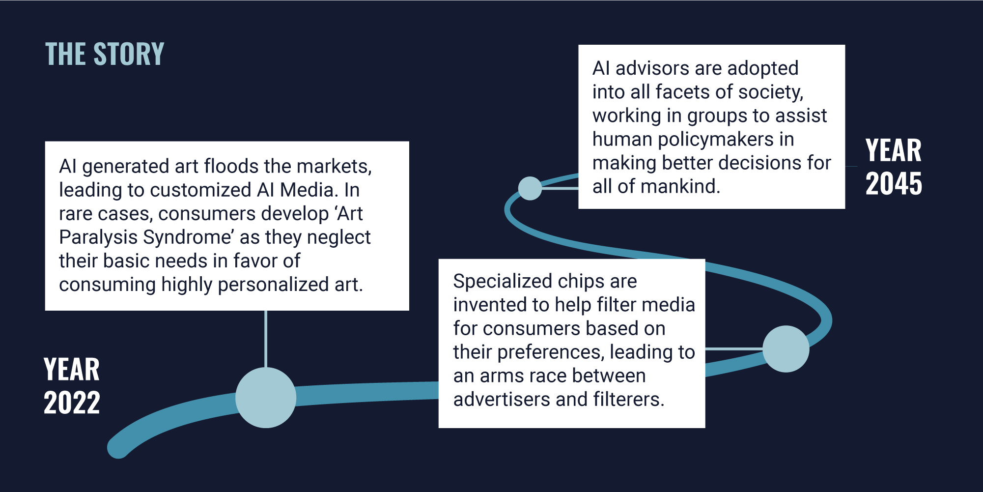 A. It has always been the case that policies lag behind disasters that drive policy adoption. However, in this world there is trust in AI advisors that allows policymakers to act with confidence. Early on it takes years for policy to change in response to global problems. For example, the fictional Art Paralysis Syndrome is a mental disorder caused by superstimulus art. Depression and listlessness afflict millions of people worldwide. It takes years for policymakers to do something about it, and their response is regulations that ban the offending art rather than a change in incentives to reduce it.