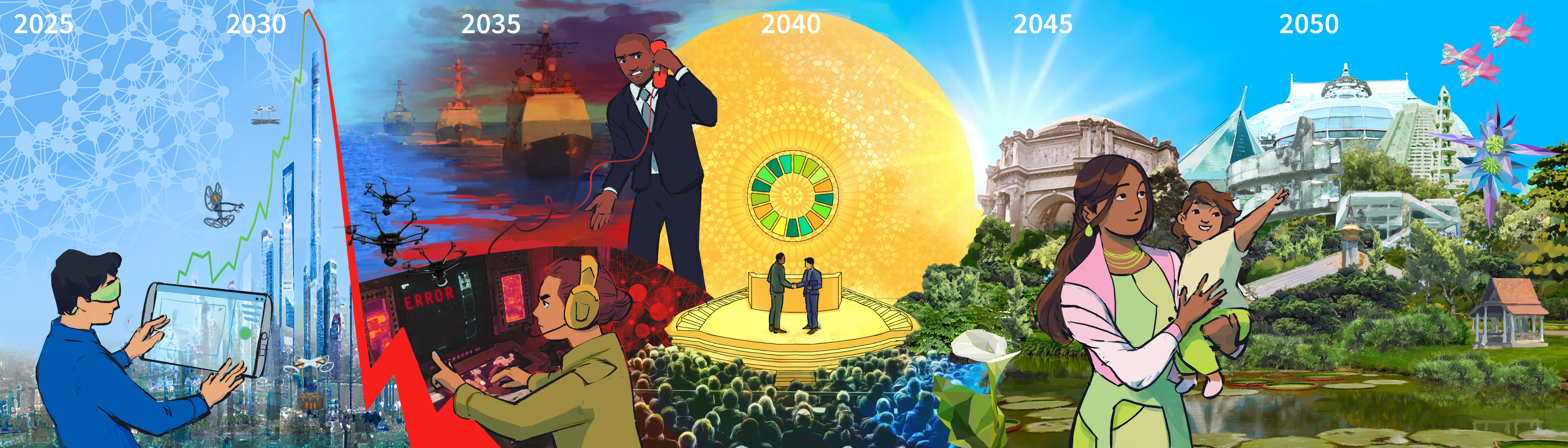 - In 2045, an inspiring, utopian end state of prosperity, with humanity close to achieving a state of existential security.