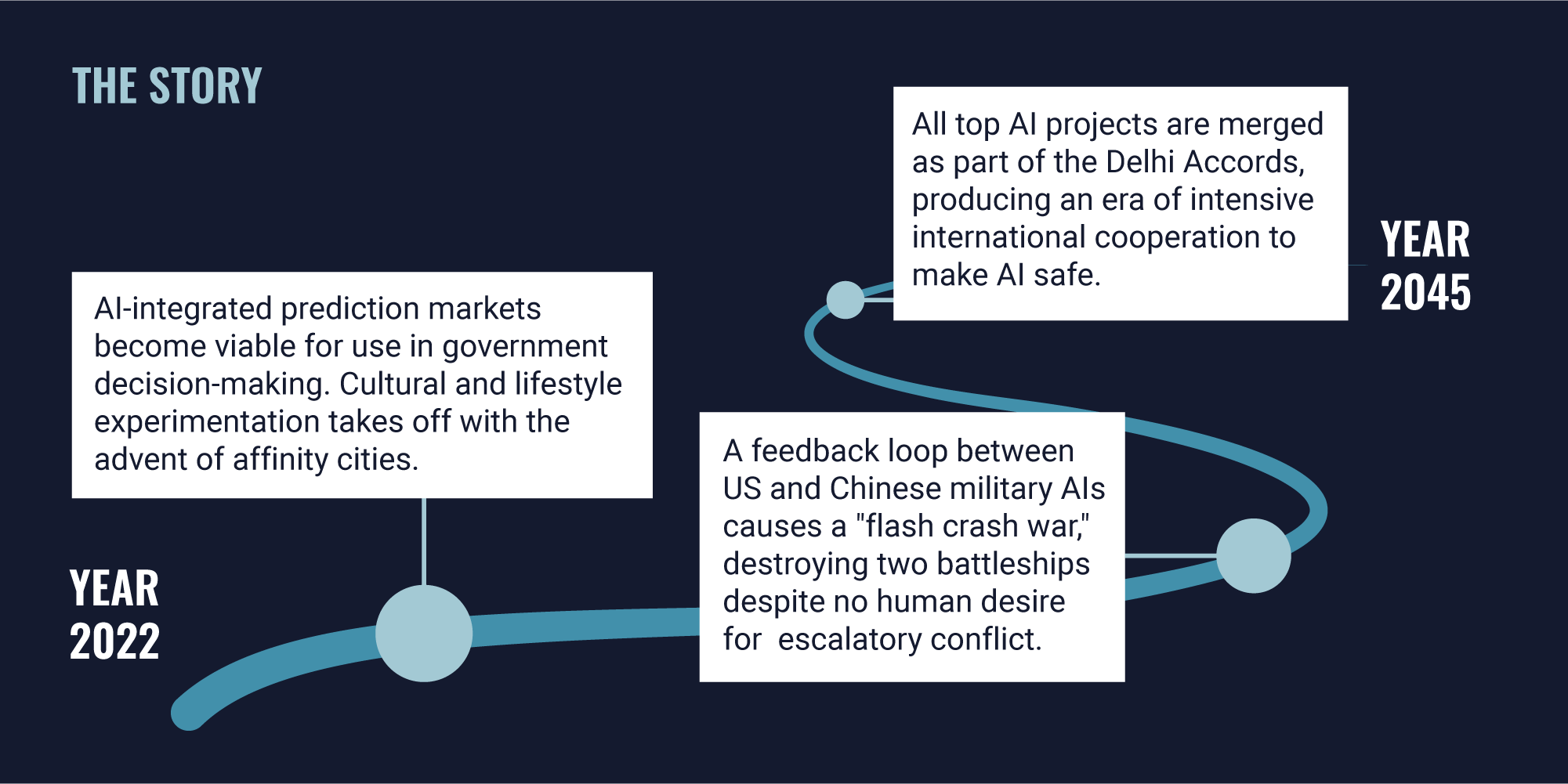 After 2038’s Flash Crash War, the world woke up to the looming dangers of AGI, leading to much more comprehensive consolidation. With the Delhi Accords, all top AI projects were merged into an internationally-coordinated Apollo-Program-style research effort on alignment and superintelligence. Proliferation of advanced AI research/experimentation outside this official channel is suppressed, semiconductor supply chains are controlled, etc. Fortunately, the world transitioned to this centralized paradigm a few years before truly superhuman AGI designs were discovered.